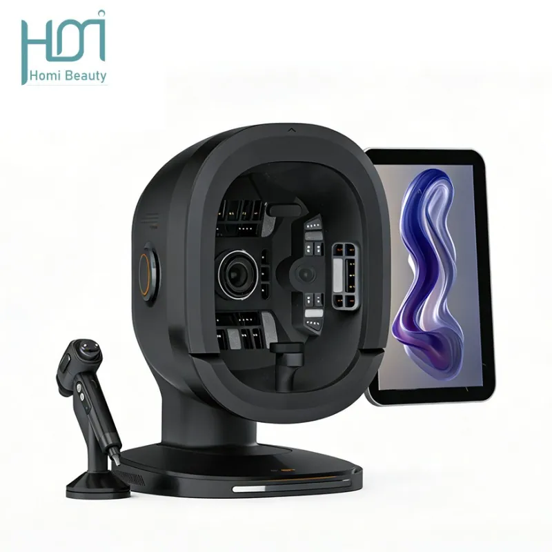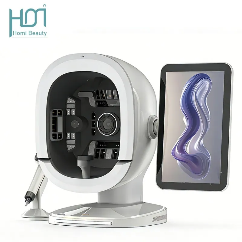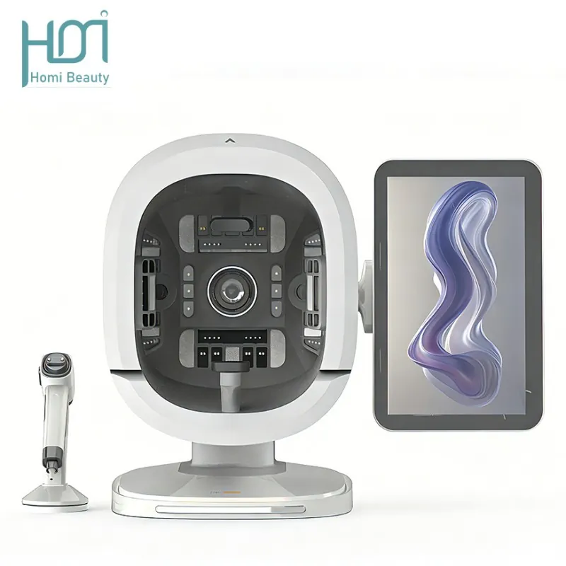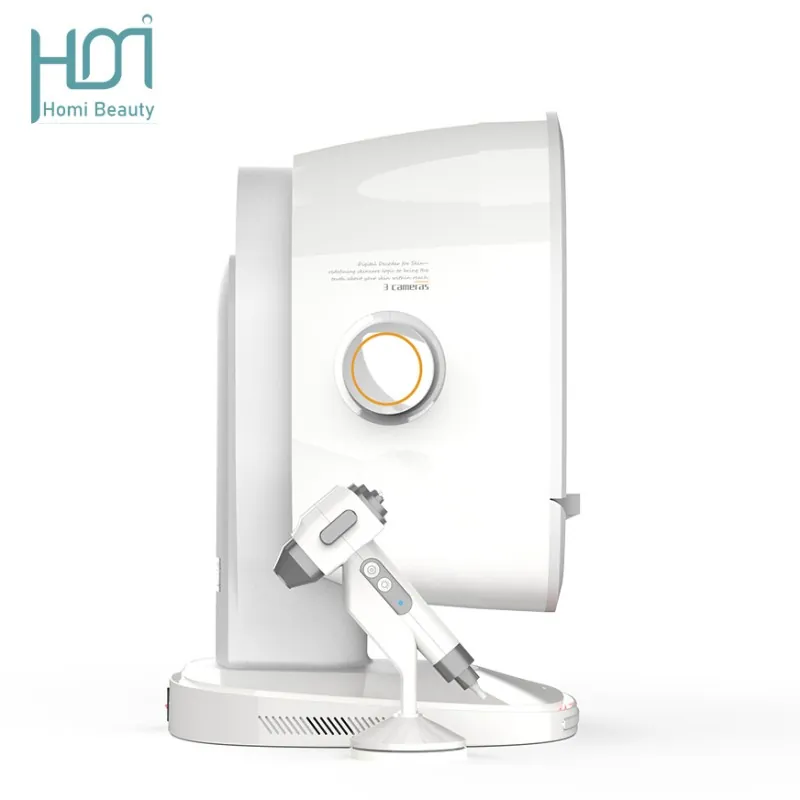HM-K33 Al Intelligent skin tester: With the aim of solving skin problems, it integrates eight spectral imaging technologies and simultaneously captures three fixed perspectives of the front, left and right sides of the face, achieving 180° coverage without blind spots. The professional and objective analysis of seventeen facial skin issues and flexible operation are the original intentions of the research and development. With just one click, it can take a photo and generate a report, making the operation more convenient.